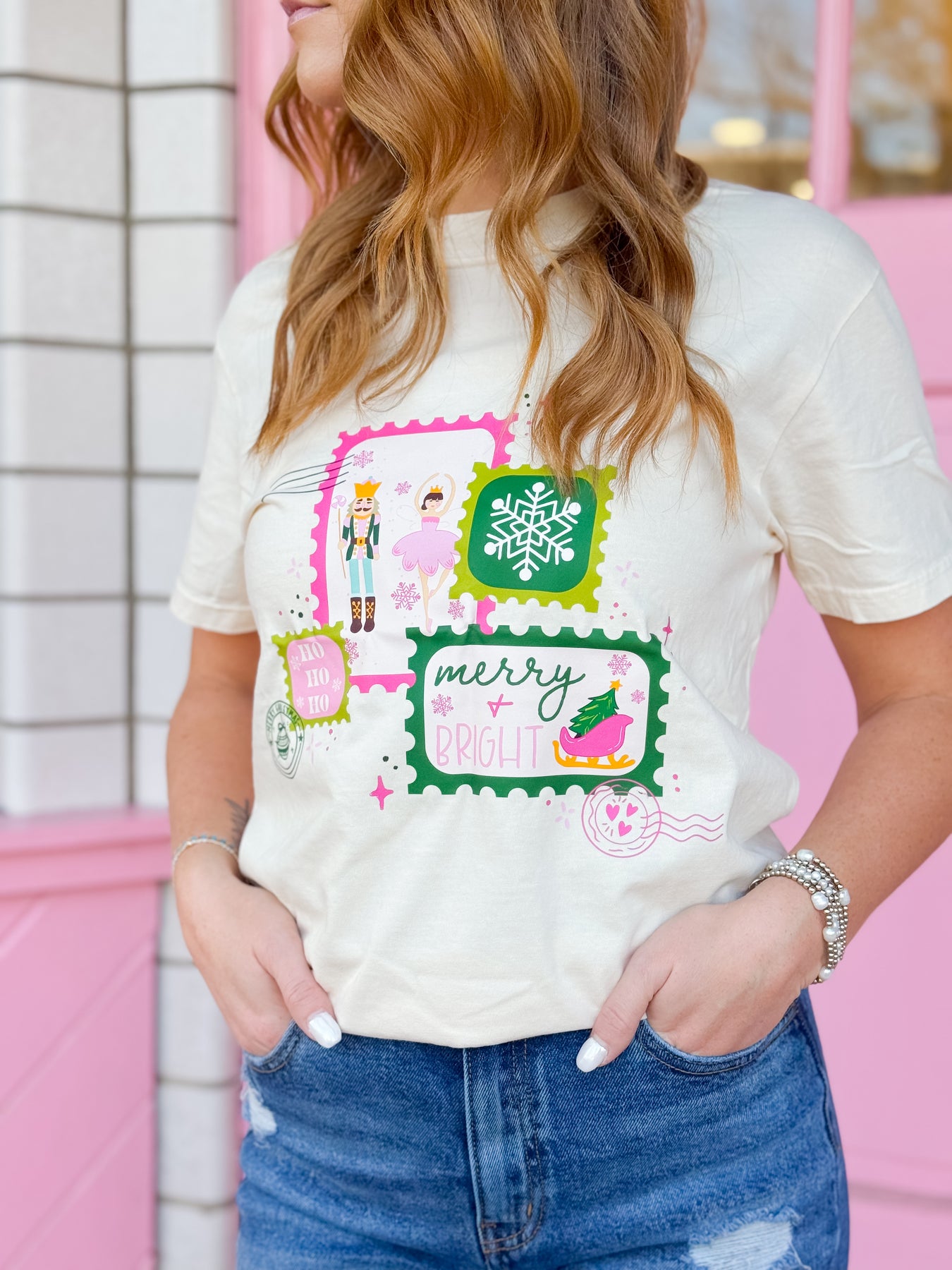 A cutie festive So Chic Christmas shirt featuring stamps with different holiday drawings created by our very own graphic designer, Anae!