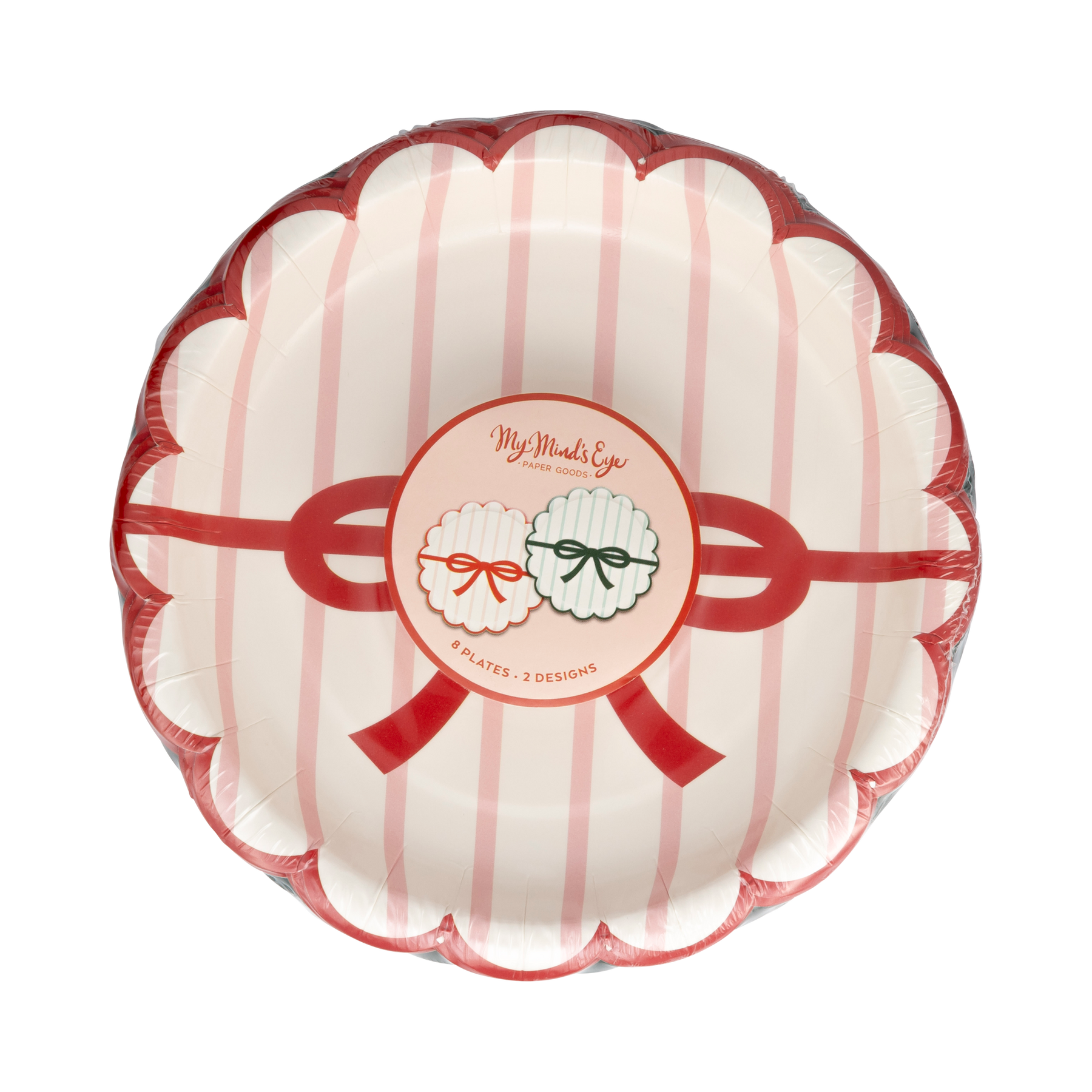 Get ready to make a playful statement at your next holiday party with this plate set! Featuring a unique combination of red, pink, green, and mint stripes, along with a charming bow design, these 7" plates will add a touch of whimsy to your table setting.