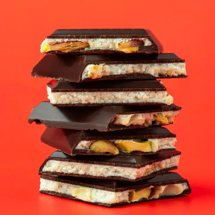 Holy Cannoli - Pistachios and flakes of cereal in a white chocolate cream cheese flavored center, enrobed in dark chocolate.