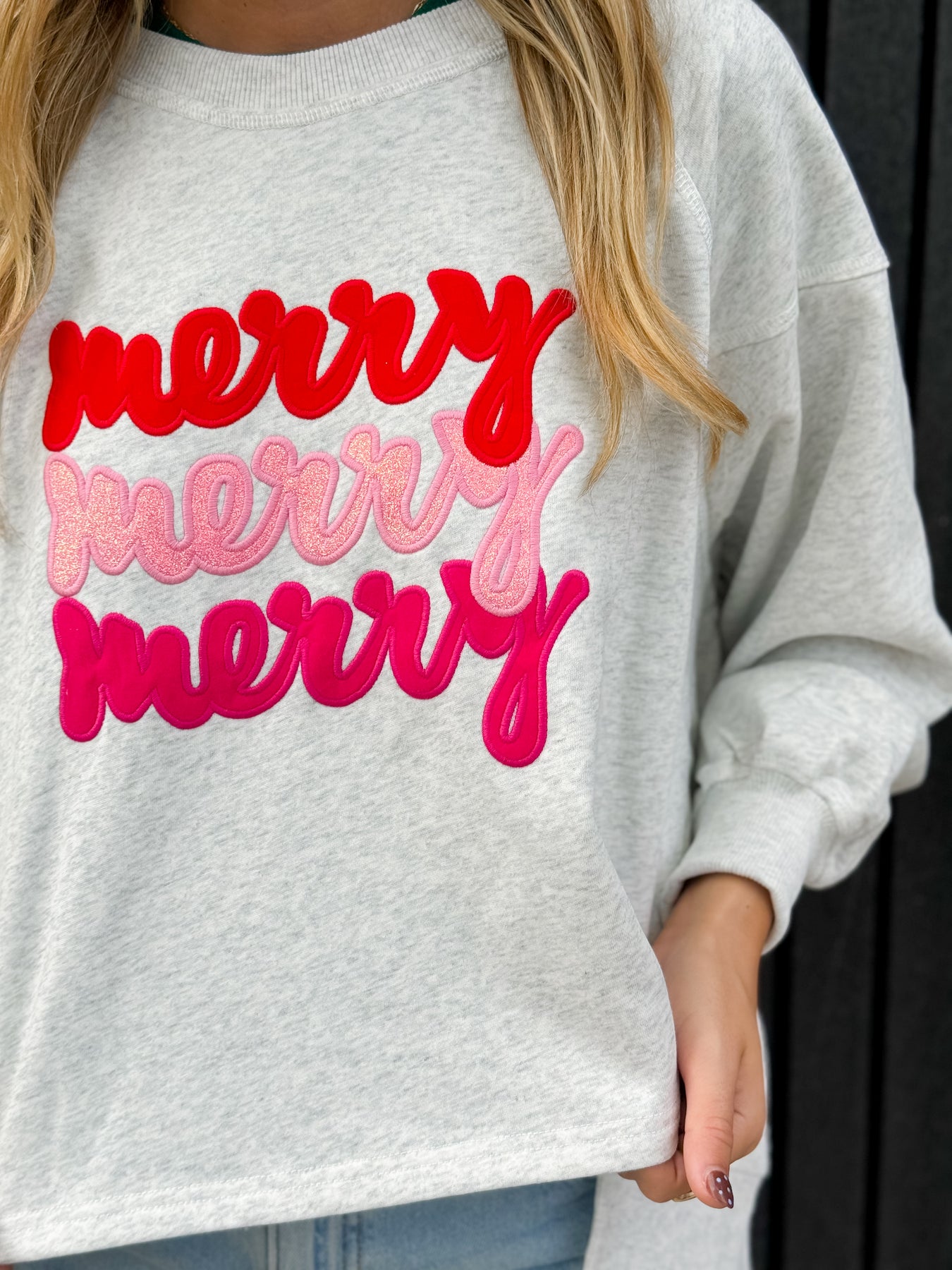 This festive pullover features a round neckline, dropped shoulders, and long sleeves with ribbed cuffs, finished with a relaxed high-low hem and bold triple "merry" lettering accented with a touch of glitter for a playful holiday sparkle.