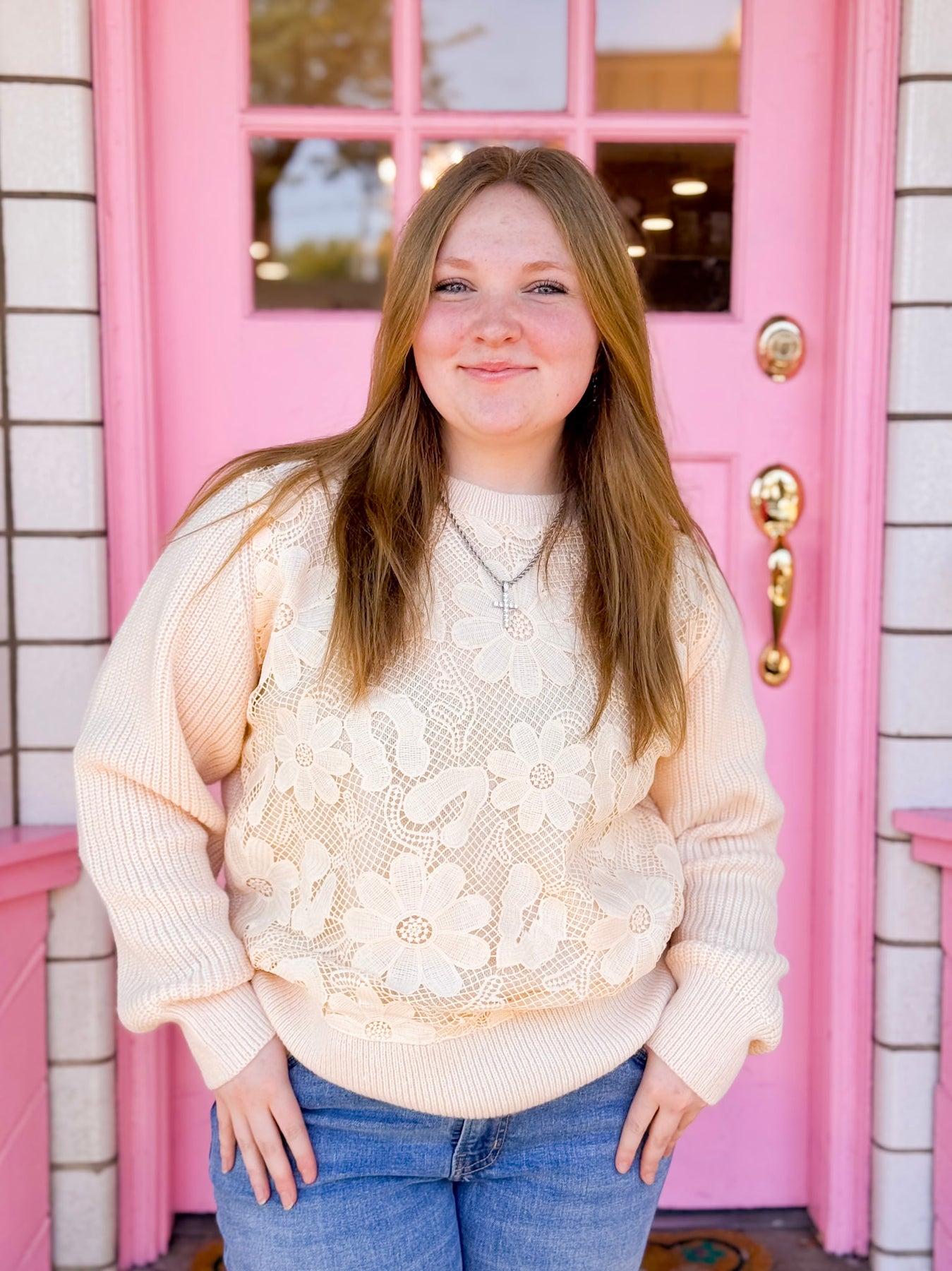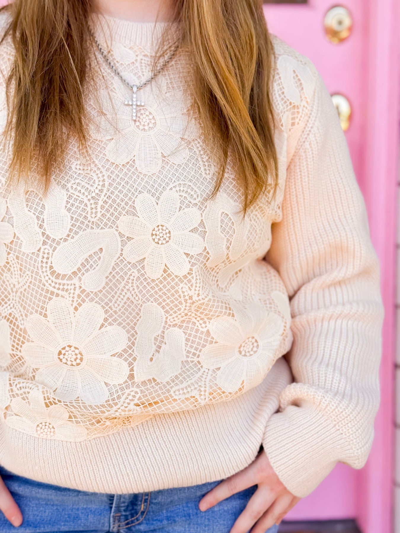 Long sleeves rib knit sweater top with front crochet contrast detail.