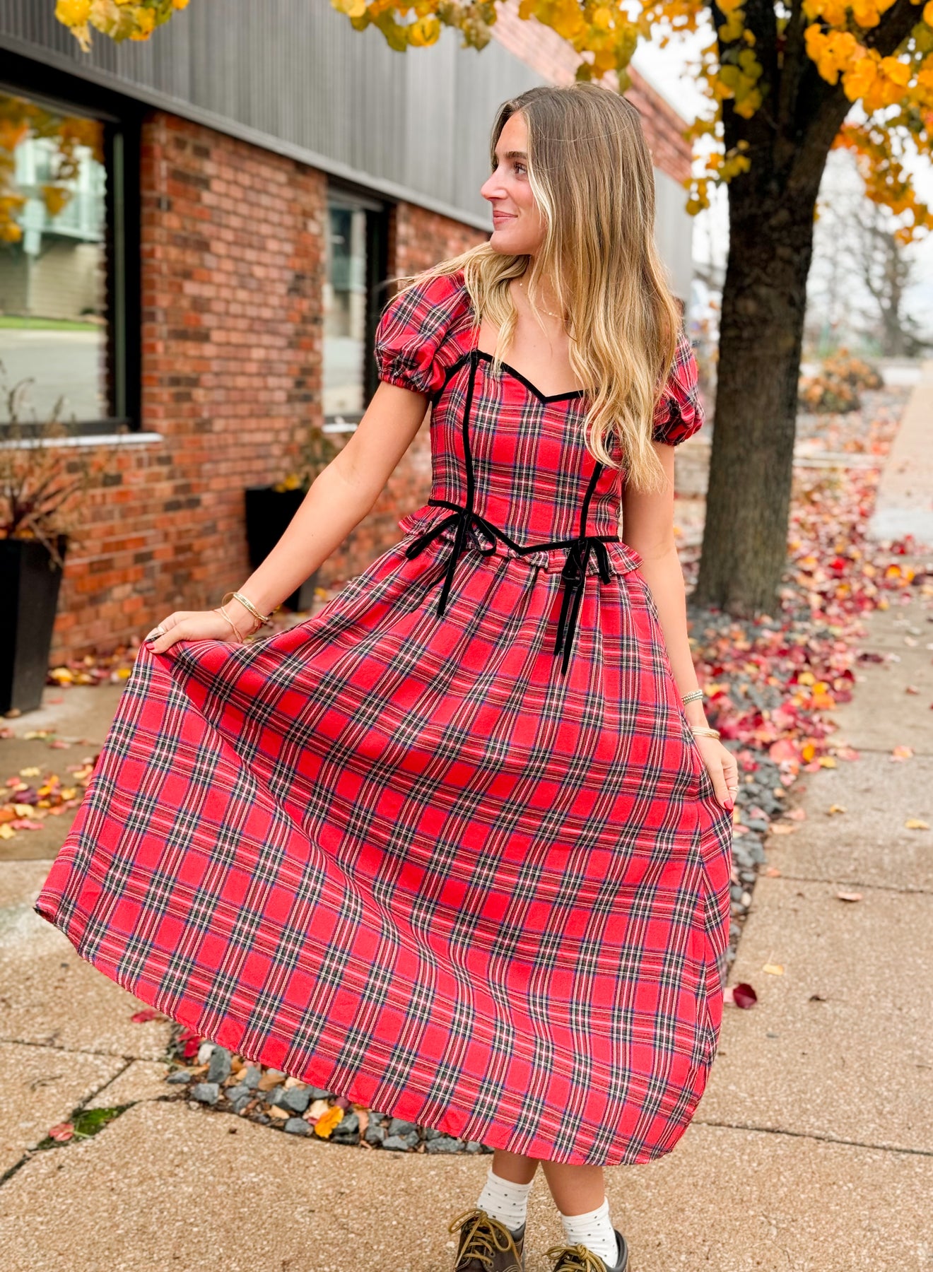 Red Plaid Mid Length Dress with puff sleeve and velvet Trim bow detail