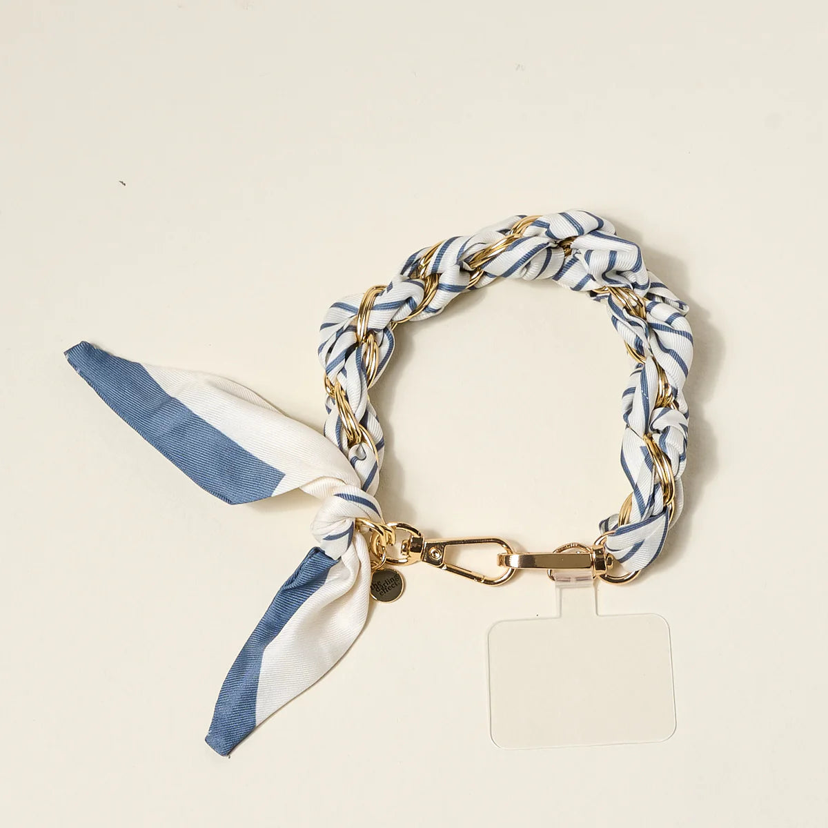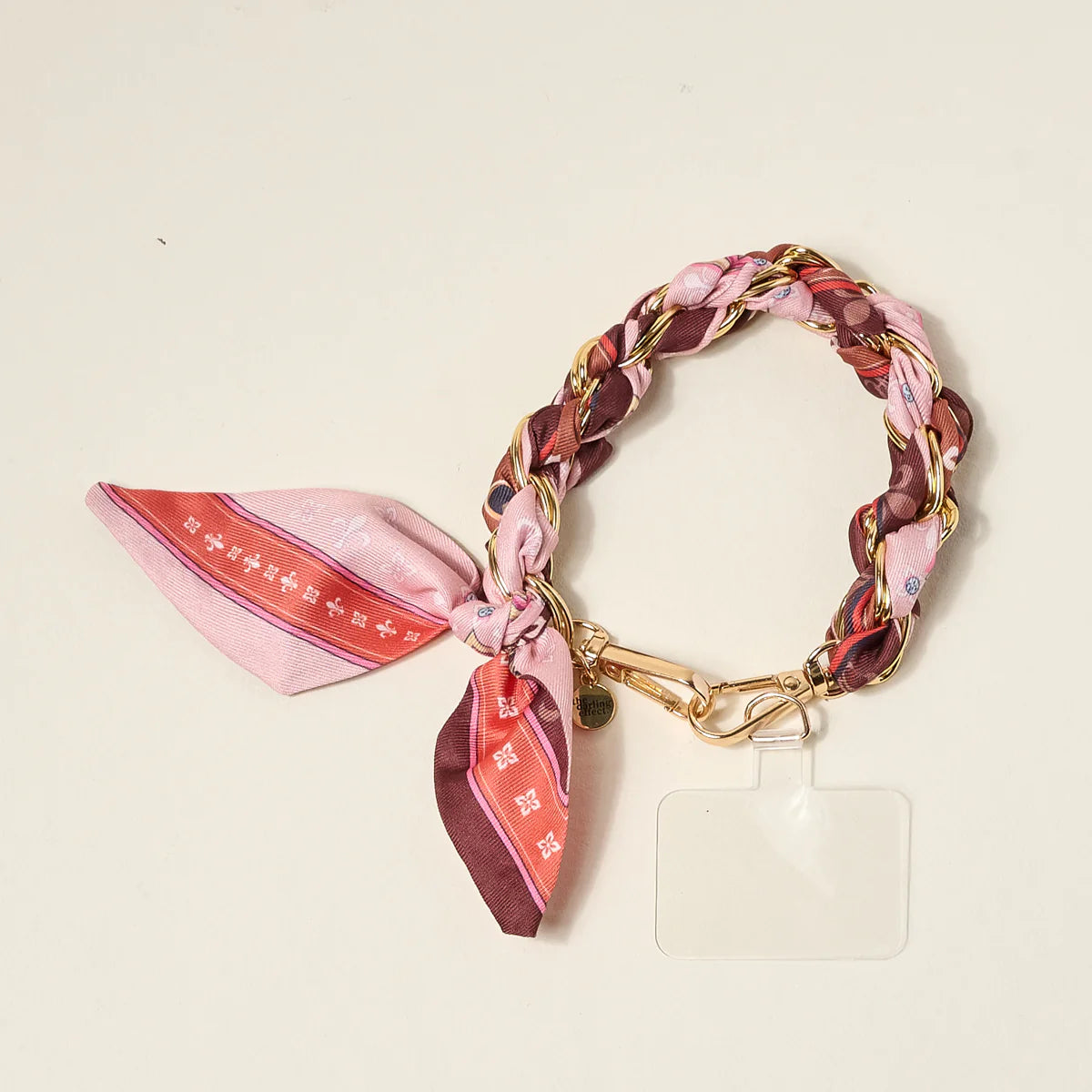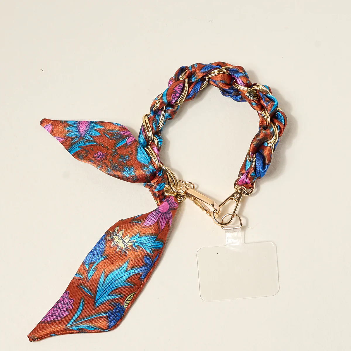This phone scarf combines fashion and function with its silky dual-pattern design that threads through a gold-tone chain. It creates an easy grip point for your phone, helping you hold it securely when your hands are full or when you need a little extra stability. The patterns bring a lively, expressive touch while the delicate drape adds movement and charm. It’s a clever accessory that blends style with everyday practicality.