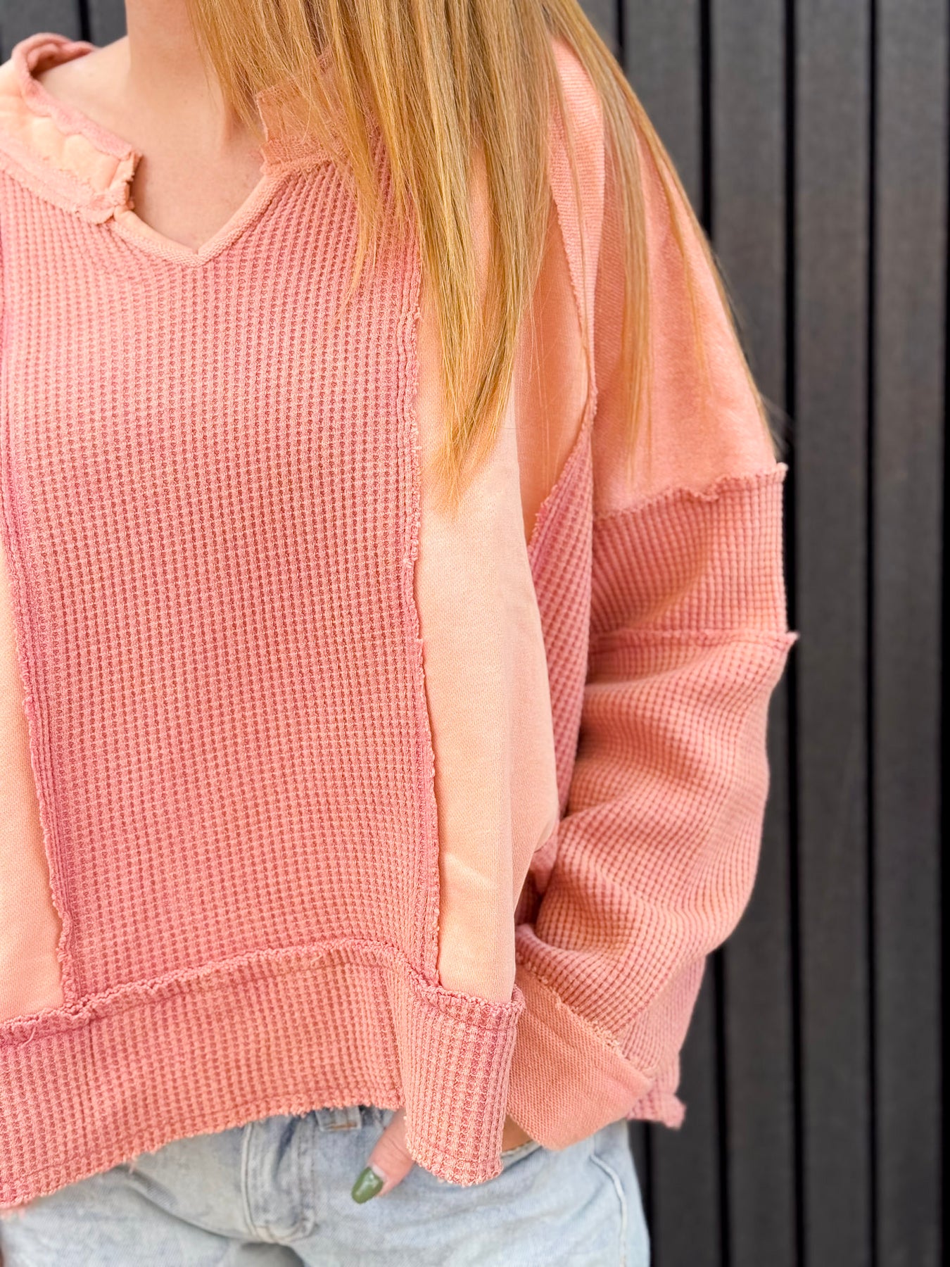Designed in notched neck long sleeve oversized fit knit top featured in french terry and thermal, frayed edge on entire garment.