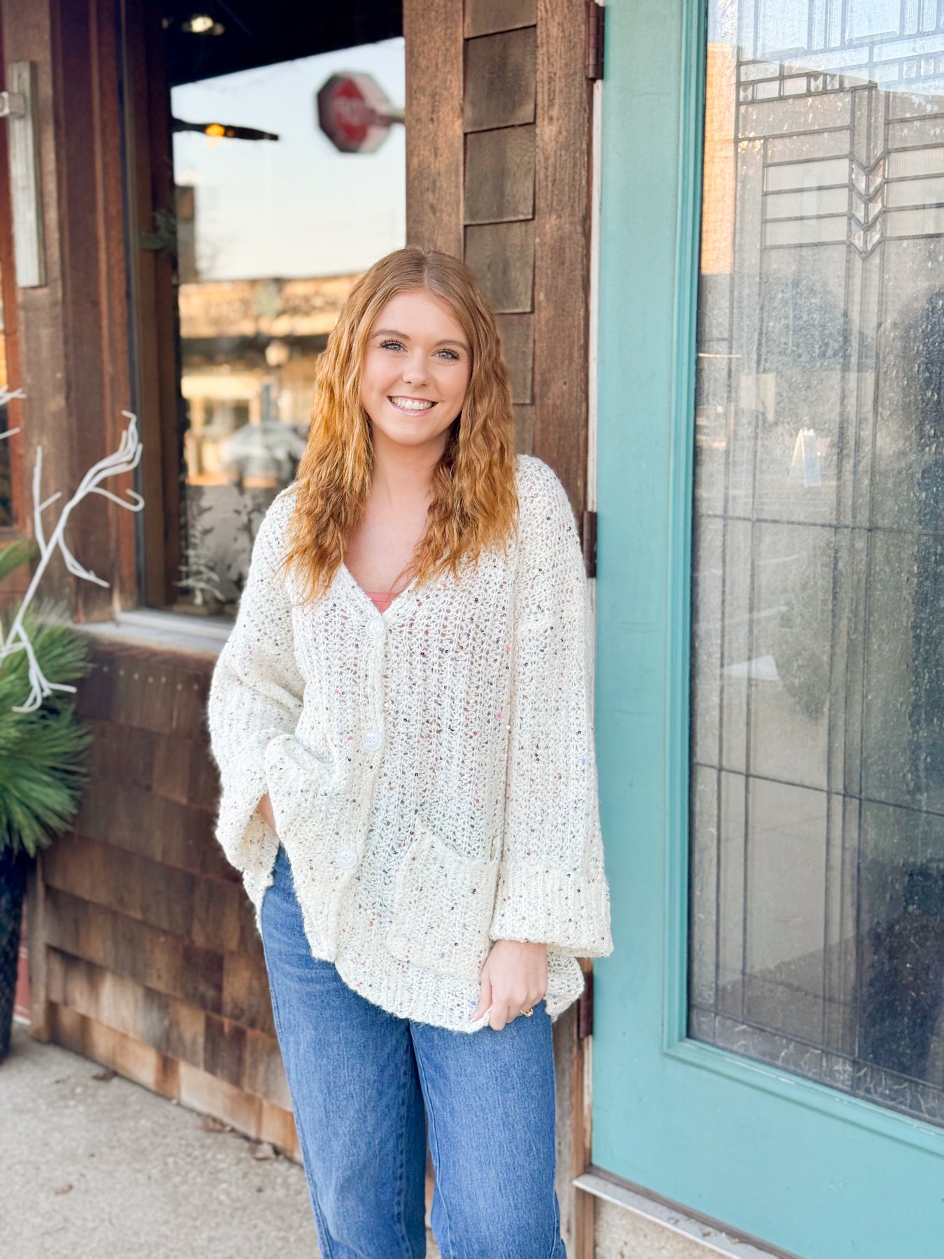 Shimmer meets comfort in this chunky knit cardigan adorned with subtle sequins for a touch of sparkle. Designed with a relaxed silhouette, button-front closure, and cozy long sleeves, it is perfect for layering over tees, dresses, or casual denim. Available in versatile shades, this piece adds effortless charm and a hint of shine to everyday style-making it a boutique favorite for transitional seasons.