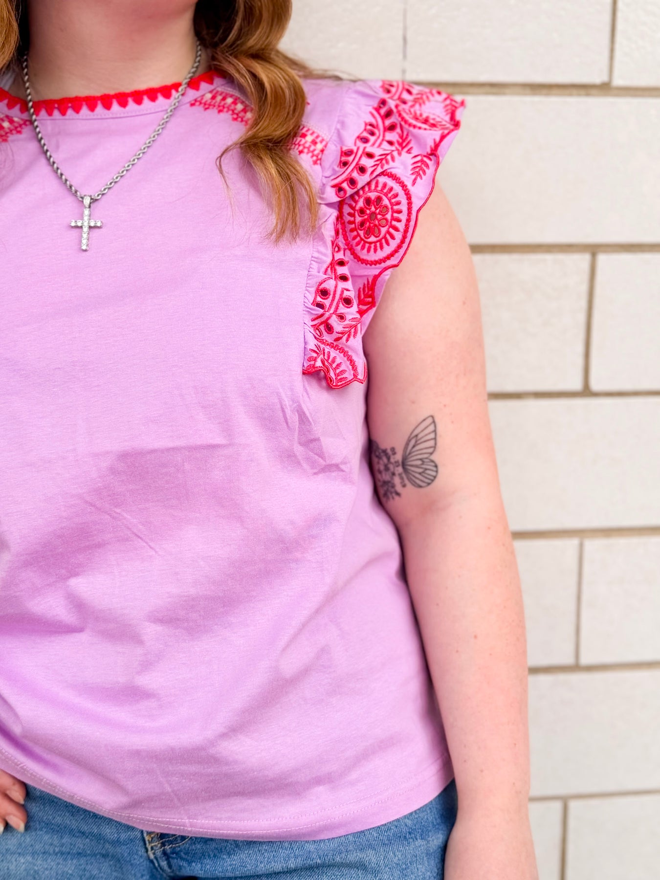 Adorned with intricate embroidery detailing on the sleeves and neck.